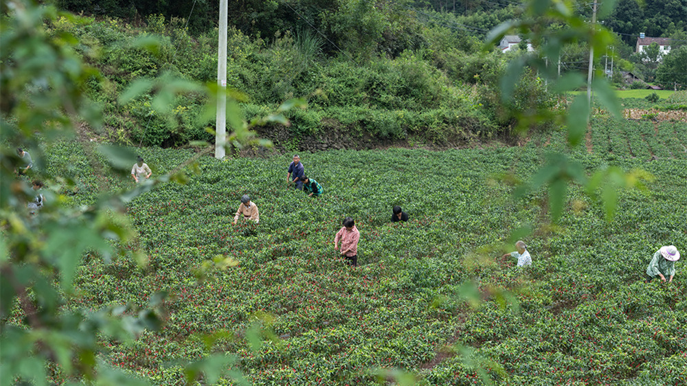 秋收时节,湖北省南漳县东巩镇太坪村辣椒基地迎来了大丰收。趁着好天气,村民忙着采摘成熟的鲜椒。(来源:南漳县融媒体中心 南漳县摄影家协会)