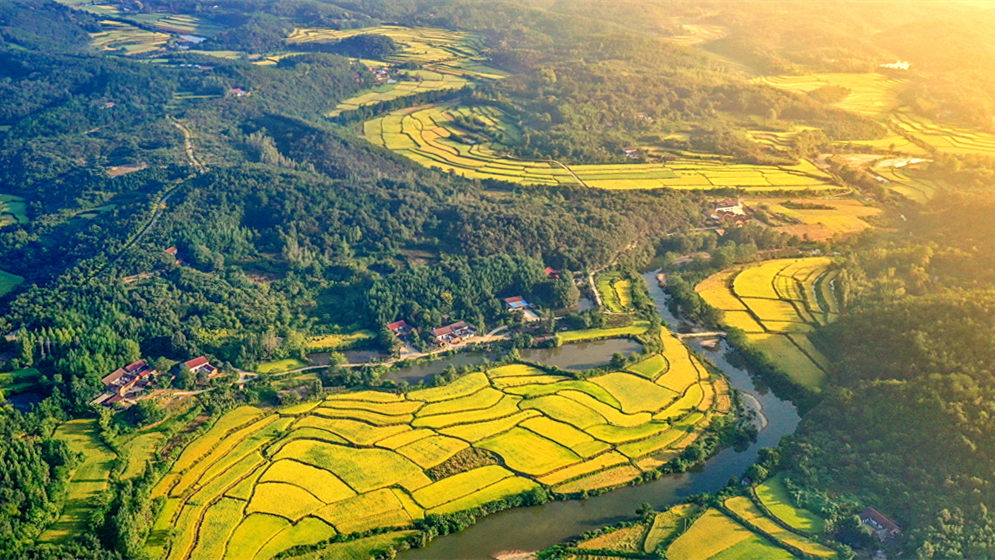 金秋九月,金稻飘香。在世界长寿之乡——钟祥市,山乡和平原片片金黄。(摄影:陈智勇)